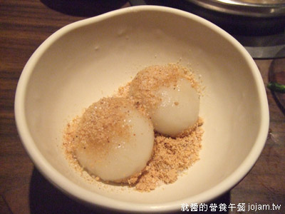 像是丸子那區的麻糬,就是巧可近期的新歡。店內沒有提供沾粉,似乎是要讓客人在涮涮鍋內,煮軟了以後撈起來吃掉。但是巧可在店裡大冒險,終於在甜點區找到花生粉,又到咖啡區找到糖,就自行組合成花生糖粉,可以沾著麻糬吃,還滿搭的! XDDD