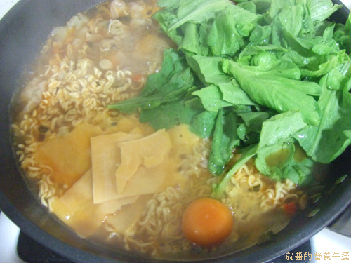 3.再次煮滾後,加入泡麵,兩分鐘後就可以加入青菜、起司片、蛋