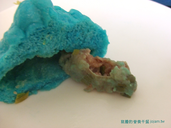 吃起來的感覺就是餡很少的肉包,藍色皮的部份並沒有特別奇怪的味道,但是吃的時候還是會覺得有點噁心。不過鹹蛋黃好好吃!!!