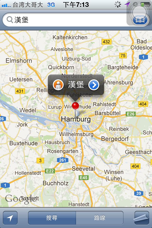 我就在google map上先定位自己在的地點,然後搜尋漢堡,地圖就顯示……
