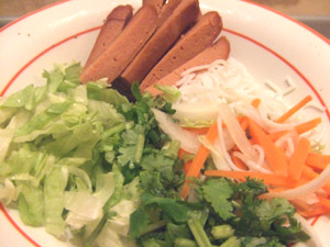 材料:米紙2張7元(愛買和頂好之類的超市就有)、萵苣葉5片5元、越南米粉1/5包13元、紅蘿蔔半根5元、熱狗1根12元、香菜1/5把2元