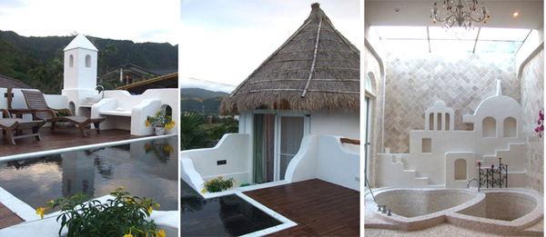 接著,大隊人馬又拼到四重溪,去參觀「茴香戀戀溫泉會館」。這間飯店,是走希臘式的地中海風情,有一整區的房間都是清爽的藍白配色。身為溫泉會館,當然能在房間內泡湯;但是這一晚可不便宜,這個樓中樓,可睡四個人的房間,要價一萬六。←這個價錢都可以去東南亞了耶!!!